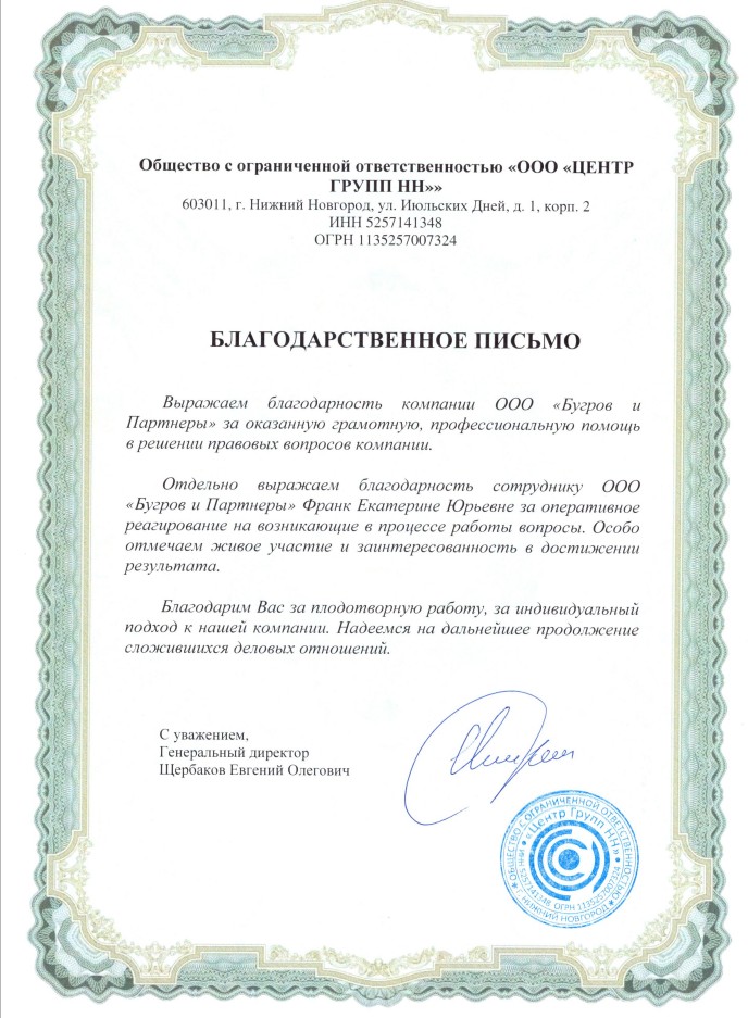 Благодарственное письмо от ООО "Центр Групп НН"