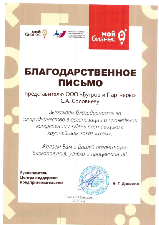 Благодарность за сотрудничество в организации и проведении конференции "День поставщика с крупнейшим заказчиком"